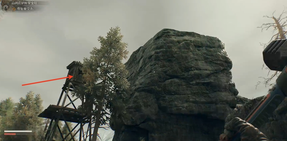 抵达山间庇护所安全塔附近后,不要直接冲向安全塔,而是先找到塔旁的一块大型岩石 —— 它通常位于安全塔侧面,体积较大且表面有明显的苔藓覆盖,是标志性的参照物。接下来需要从这块大石头的后方绕一圈,这样做不仅能避开安全塔正面可能存在的敌人(如驻守的感染者),还能找到更适合跳跃的起跳点。绕到岩石后方后,仔细观察安全塔的位置:安全塔与岩石所在平台之间的距离不算太远,但需要精准跳跃才能到达,建议先调整角色站位,确保双脚站在平台边缘的稳固处,避免因站立不稳导致起跳失误。