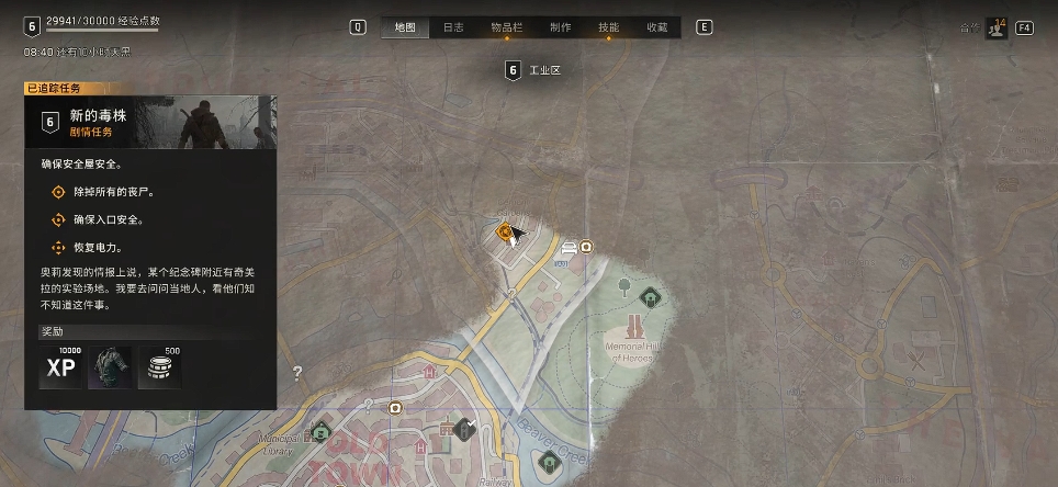 需先完成主线任务 “电力保障”(修复发电厂供电),之后奥莉薇亚会在修道院触发对话,指派玩家追踪男爵的踪迹,此时 “新的毒株” 任务正式激活。建议此时将等级提升至 15 级以上,解锁至少 2 个兽性技能槽,以便应对后续的精英丧尸。