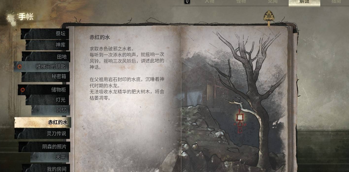 按照 “火山→水→树” 的顺序,在正确时机敲响三个风铃后,寺庙旁的水池会发生明显变化,原本清澈的水会逐渐转为深红色,这意味着 “赤红的水” 谜题已成功解开。