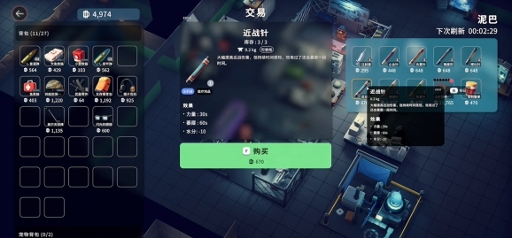 任务的第一步是获取核心道具 “近战针”,这种特殊道具无法通过野外搜索获取,只能在解锁 “健身房” 的购买权限后,从健身房的 NPC 商人处购买。解锁健身房购买权限的条件并不复杂,通常只需完成前期 “基础体能训练” 或 “物资运输” 等新手任务即可,玩家可先推进简单任务解锁权限,再专门购买近战针。关于购买数量,建议直接购买两针,这并非多余准备,而是由近战针的特殊机制决定的 —— 每支近战针的有效时间仅 30 秒,使用后能大幅提升角色的近战攻击伤害与攻击速度,让击杀拾荒者变得轻松;但 30 秒有效期结束后,会进入 60 秒的 “萎靡期”,此时角色的近战能力会大幅下降,甚至比未使用道具前更弱,完全无法应对拾荒者的攻击。