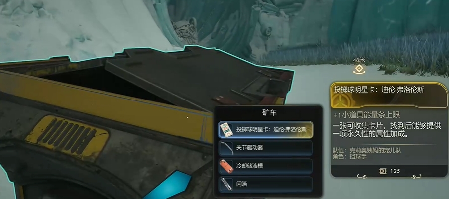 当玩家找到矿车后,即可进入矿车内部寻找卡片。与部分隐藏较深的收集品不同,“迪伦・弗洛伦斯明星卡” 在矿车内的摆放位置较为明显,无需翻找复杂的容器或角落,进入矿车后稍作观察就能发现。此时按下游戏内的互动键,即可成功拾取这张明星卡。拾取瞬间,游戏会明确显示卡片信息:名称为 “投掷球明星卡:迪伦・弗洛伦斯”,属性加成是 “+1 小道具能量条上限”,同时系统会提示这是一张 “可提供永久性属性加成的可收集卡片”。至此,卡片收集流程全部完成,玩家可在角色属性界面中确认小道具能量条上限的提升,后续冒险中也能持续享受这一加成带来的便利。