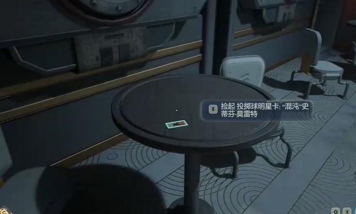 确认卡片位置:靠近桌子后,可看到桌面上有一张彩色卡片,边缘带有金色花纹,这就是 “混沌史迪芬莫雷特明星卡”,卡片会轻微发光,即使被书籍遮挡也能通过光芒快速识别。