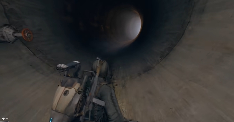 继续前进至隧道深处,会看到 “左侧墙壁旁的出水口”—— 出水口有水流涌出,下方形成小水洼,管道就位于 “出水口上方的墙壁上”;