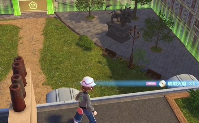第四步,拾取金光宝可梦球获取招式学习器。跳上蓝色屋顶后,屋顶会形成一个小型平台,玩家向平台的左上角方向移动,就能看到一道显眼的金色光芒。这道金光正是喷射火焰招式学习器的专属标识,光芒下方摆放着一个金色宝可梦球。靠近宝可梦球后,按下互动键捡起,就能成功获得喷射火焰招式学习器,整个获取流程到此圆满结束。