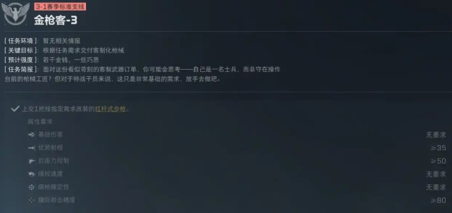与第一阶段类似,金枪客 3 阶段要求改装一把杠杆步枪并上交,任务核心仍是按要求完成配置。官方同样提供了对应的改枪码,玩家直接使用即可,改枪码为:6I5HPDO049H3TLFDHMKHO。输入改枪码后,杠杆步枪会自动匹配任务所需的配件,无需额外调整,提交后即可完成该阶段任务,流程简单,重点在于准确输入改枪码,避免因配置错误导致任务失败。