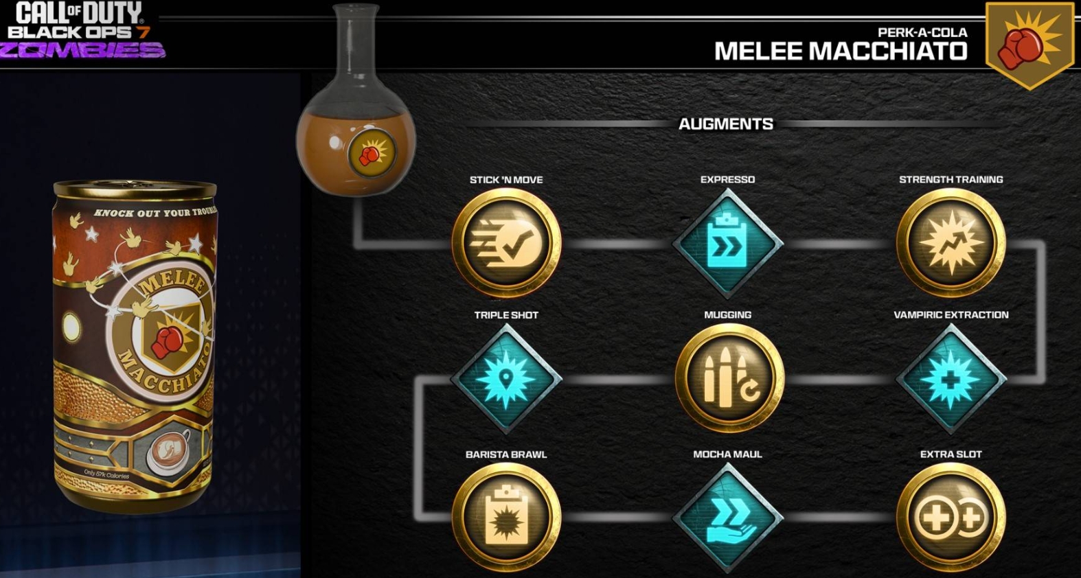 在《使命召唤:黑色行动 7》中,“近战玛奇朵” 特长可乐是专为 “纯近战玩法” 打造的核心增益道具,玩法全面升级后,核心效果为 “将武器枪托替换为致命拳击”,搭配更快的攻击速度、随回合递增的伤害,以及冷兵器专属伤害倍率,让近战成为极具冲击力的战斗方式。在此基础上,它还包含丰富的大型改造与小型改造选项,覆盖攻速强化、生命续航、范围攻击等维度,新增摩卡重击、咖啡师乱斗等实用内容,进一步放大近战玩法的爽感与实用性,具体详情如下: