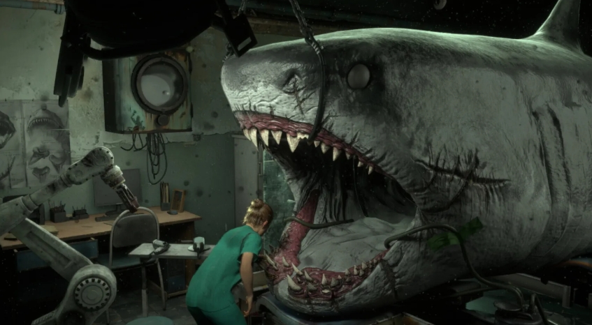 游戏的视觉与音效设计进一步强化了恐怖氛围。昏暗的深海诊所内,仅有手术灯提供微弱照明,光线所及之处是鲨鱼布满褶皱的皮肤、寒光闪闪的利齿,以及散落的医疗工具与血迹,阴影中仿佛暗藏无数未知威胁;背景音效采用低沉的环境音与心跳声交织,工具碰撞的清脆声响、鲨鱼呼吸的沉重鼻音、氧气装置的嘶嘶声,都在不断放大玩家的紧张感,偶尔响起的鲨鱼躁动声更是让人不寒而栗。这种 “视觉 + 听觉” 的双重冲击,让玩家仿佛身临其境,沉浸式感受与巨型掠食者共处一室的压抑与恐惧。