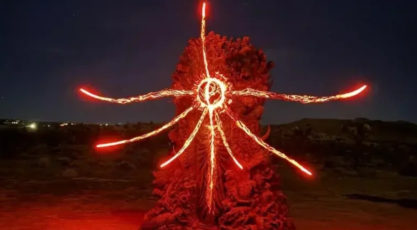 早在 TGA 宣传期开启之初,Geoff Keighley 便在社交平台发布了一张矗立在莫哈维沙漠中的怪异雕像照片,雕像整体造型酷似被封印的恶魔传送门,周身还萦绕着神秘的发光纹路,这一 “谜语人” 式的操作瞬间点燃玩家热情,关于雕像归属的猜测层出不穷,从《暗黑破坏神 4》新资料片、《战神》埃及篇章到《上古卷轴 6》预告,各类脑洞说法一度刷屏游戏圈,直到 mp1st 曝光的商标信息出现,才让舆论焦点彻底转向拉瑞安的《神界》系列。