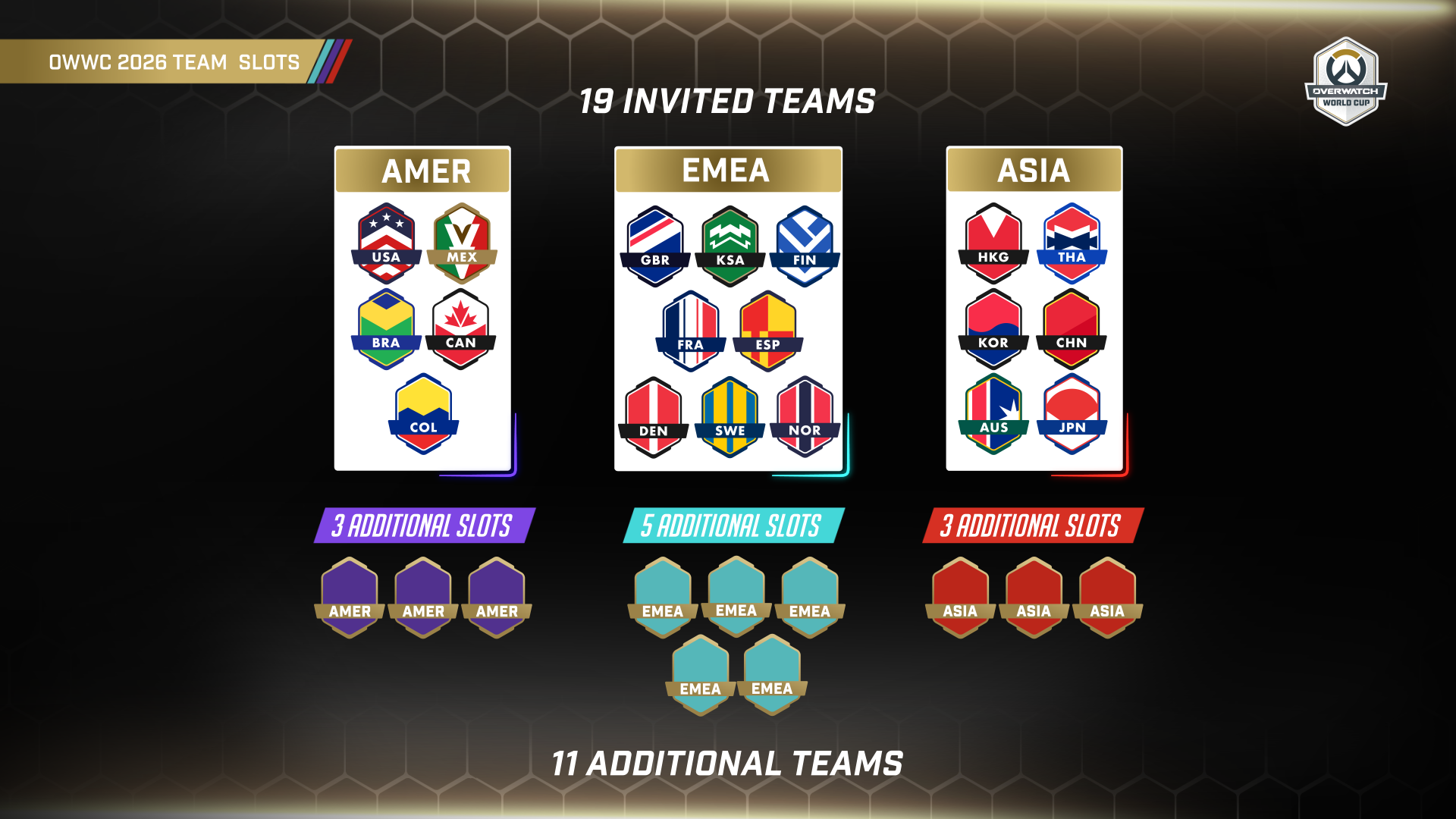2026年,将有30支队伍参加OWWC:19支受邀队伍和11支外卡队伍。受邀队伍选自2023年前16名队伍和欧中非(EMEA)赛区表现最佳的3支队伍。另有11支外卡队伍将通过2026年世界杯新增的外卡赛获得参赛资格。现在就做好准备,代表你的国家/地区出战,创造OWWC最佳战队的历史吧!参与OWWC不仅仅是在世界舞台上竞技,更重要的是融入项目的竞争精神,并激励你的队友。即使你的国家/地区最终未能入选30支队伍之列,你仍然有机会参与到项目中来——继续阅读,了解详情!