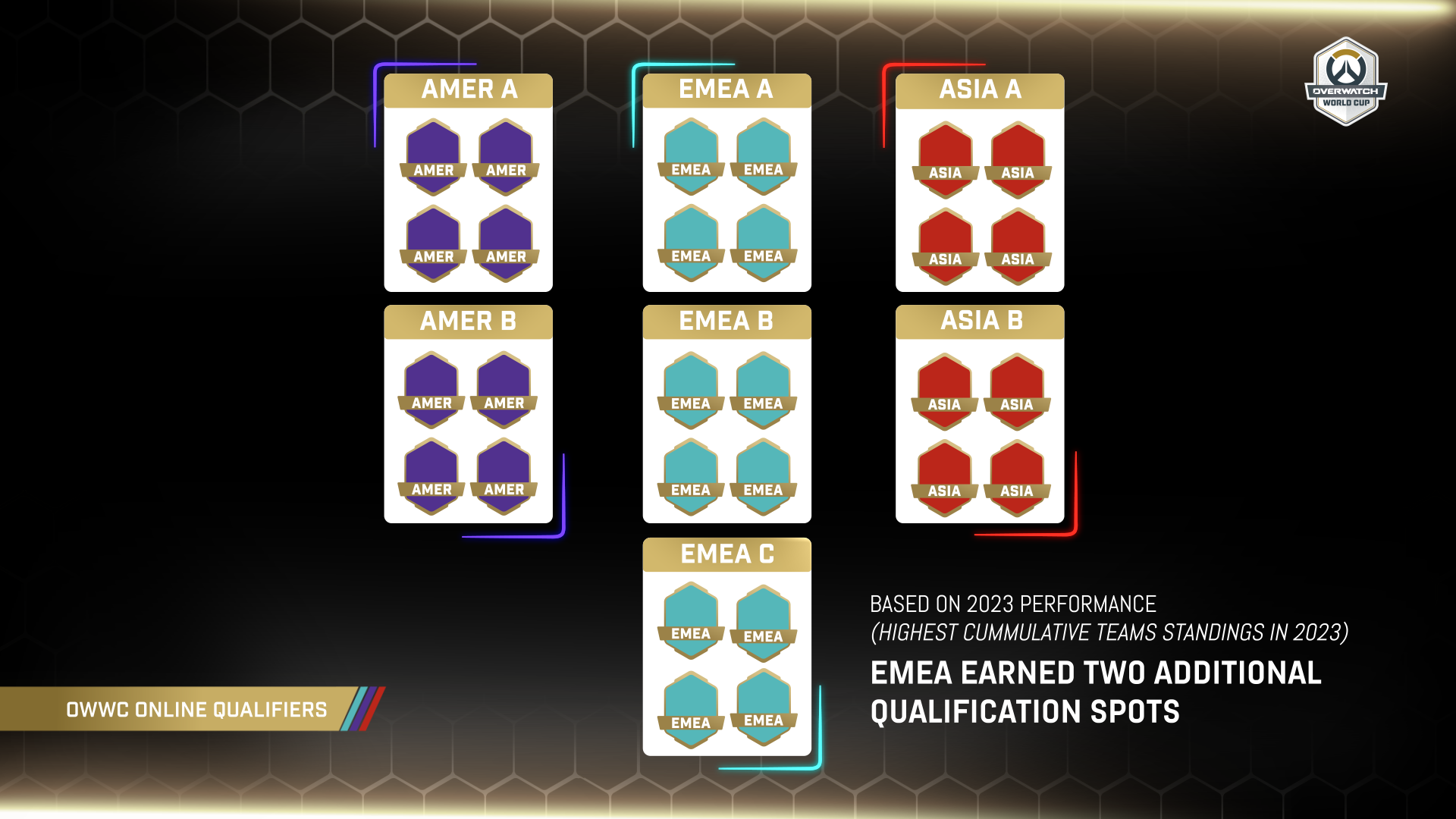 28支队伍在根据地理位置以及网络情况优化分组的赛区内竞争:美洲赛区A/B区、欧中非赛区A/B/C区、亚太赛区A/B区。每个赛区的前两名队伍将晋级小组赛,同时直通小组赛的有2023年OWWC的冠军沙特阿拉伯战队和亚军中国战队。