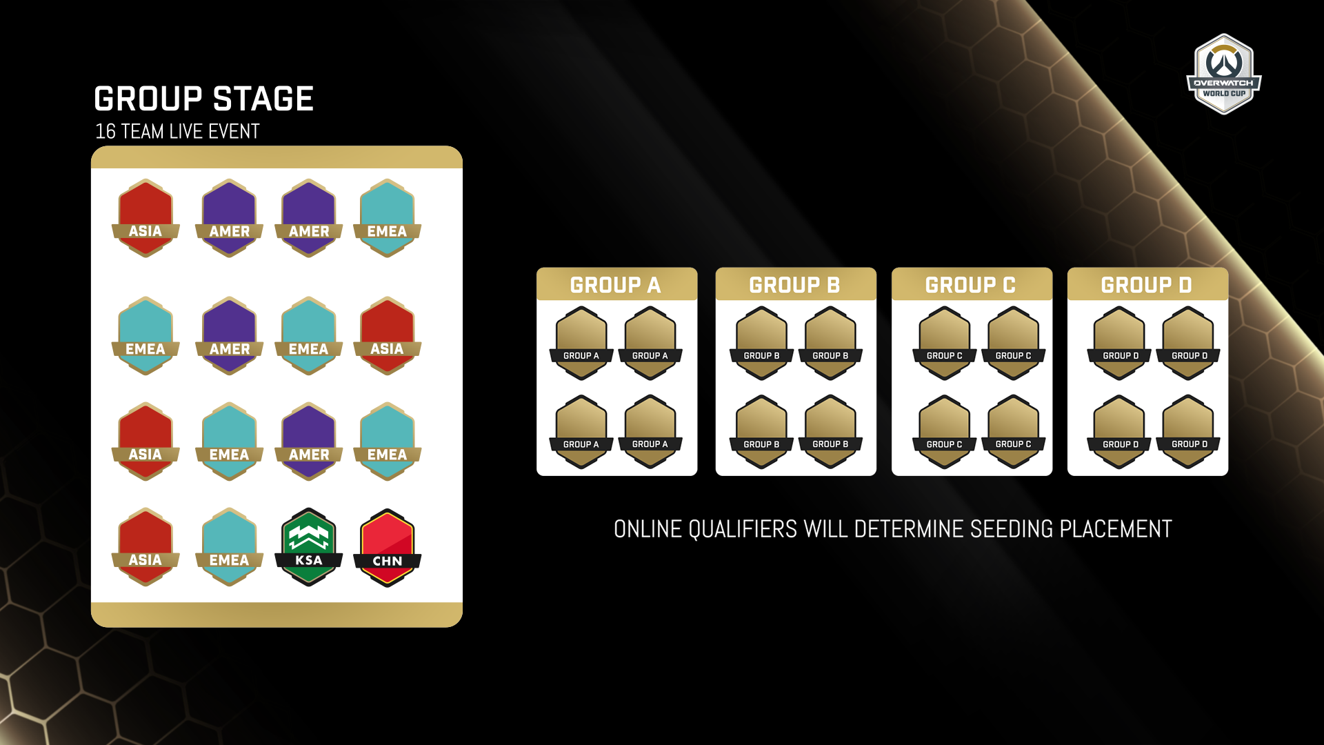 小组赛前,前16支队伍将在线上节目中被分为四个小组,每组四支队伍。分组将根据线上资格赛的成绩和排名进行。