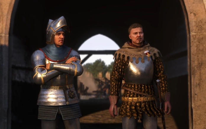 致敬《上古卷轴 5》膝盖中箭梗的衍生内容。主角亨利和头上插箭的 NPC 对话